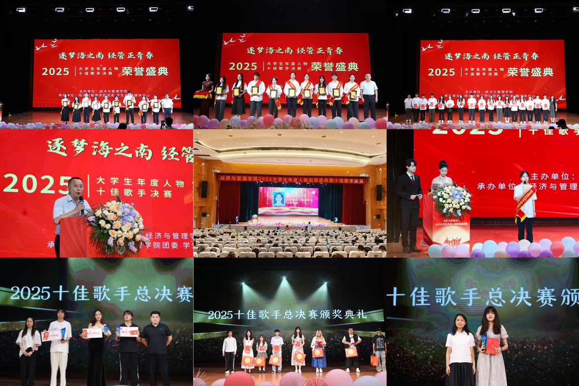 5月27日下午,海南师范大学经济与管理学院2025大学生年度人物荣誉盛典暨十佳歌手决赛在桂林洋校区大学生活动中心演艺厅举行。学院党委书记符史涵,院长陈江,党委副书记陆娜,学工办主任陈肇第,团委书记刘贺,辅导员徐丽,李佳佳,崔杨俊麒,张玉洁,特邀嘉宾李哲,海南春光食品有限公司符艺(校友),孙平出席,600名学生现场就座观礼。
